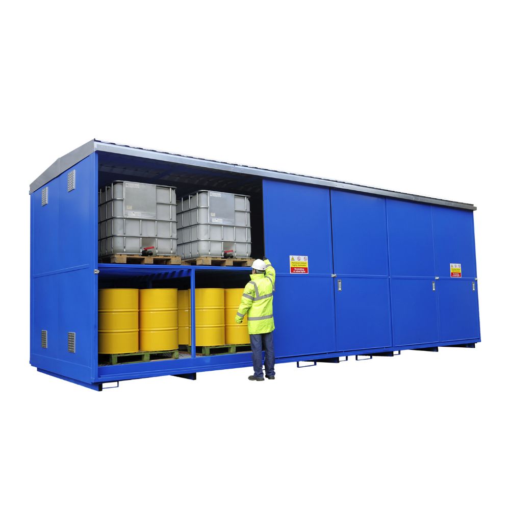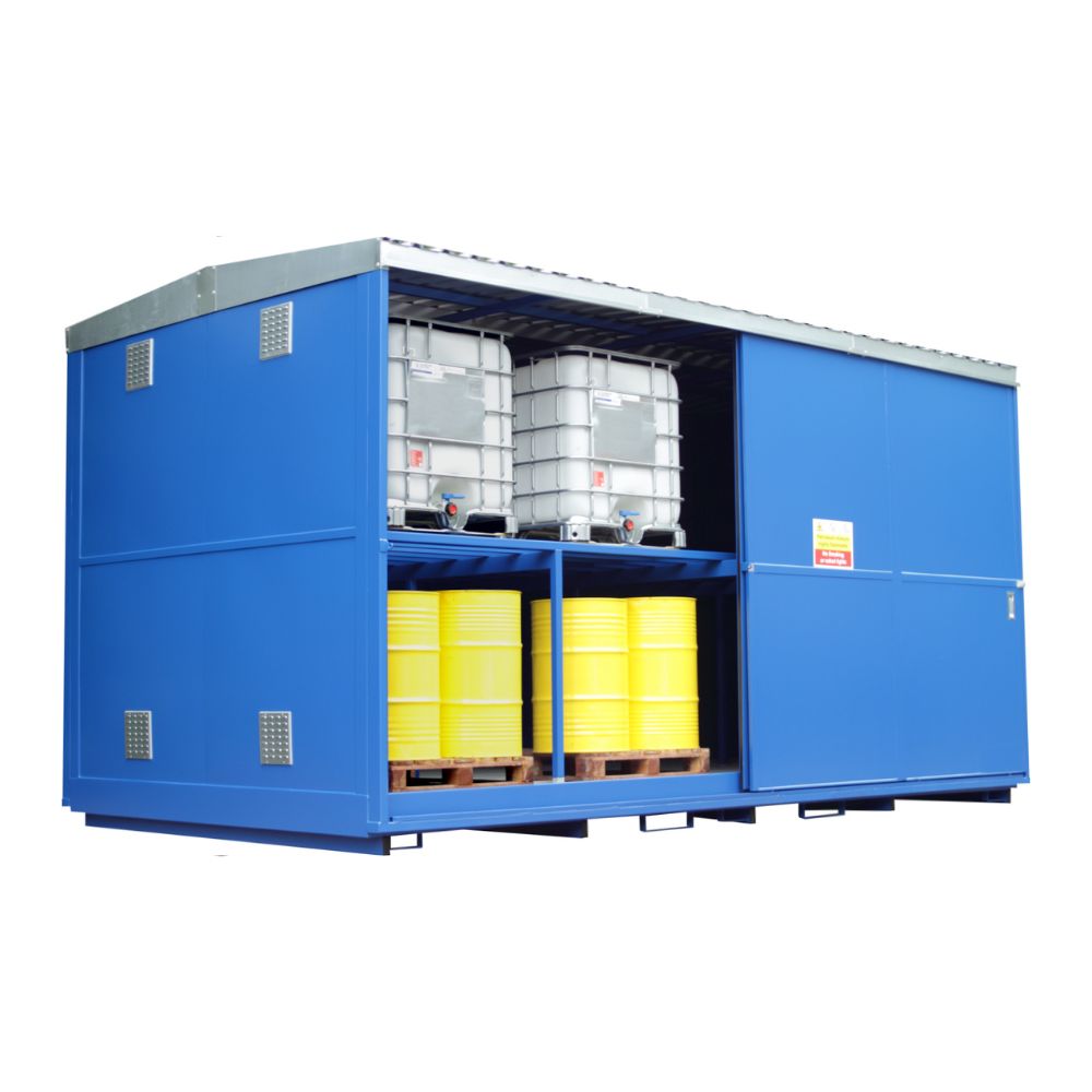Our E-DPSU16/4C is designed for the storage of 4 x IBCs or 16 x 205 litre drums (palletised) on two levels. Access is provided with sliding doors on one 3m side.